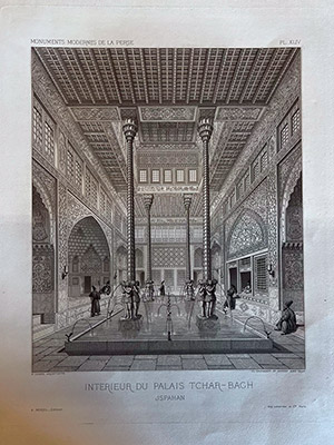 A captivating and rare glimpse into Iran’s architectural past through the lens of renowned architect Pascal Coste. This enchanting limited-edition illustration published in 1867 as part of the rare surviving book “Monuments Modernes De La Perse” reveals the interior of the Chahar Bagh Palace, nestled in the heart of Isfahan. It’s a historic gem from this limited-edition book, with other surviving copies part of the British Museum and Victoria & Albert collections. A masterpiece brought to life through the exquisite engravings of Claude Sauvageot (1832–1885) and Jean Charles Huguet (1815–1867). The image exudes a timeless charm, inviting you to explore the opulence and grandeur of a bygone era within the confines of this Persian architectural marvel.