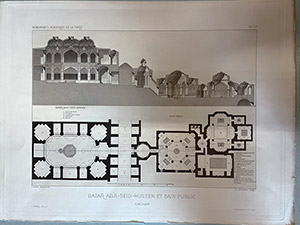 A captivating and rare glimpse into Iran’s architectural past through the lens of renowned architect Pascal Coste. This enchanting limited-edition illustration published in 1867 as part of the rare surviving book “Monuments Modernes De La Perse” reveals the architectural design of Kashan’s historic Haji Seid Hussein Bazar and Baths. It’s a historic gem from this limited-edition book, with other surviving copies part of the British Museum and Victoria & Albert collections. A masterpiece brought to life through the exquisite engravings of Claude Sauvageot (1832–1885) and Jean Charles Huguet (1815–1867). The image exudes a timeless charm, inviting you to explore the opulence and grandeur of a bygone era within the confines of this Persian architectural marvel.