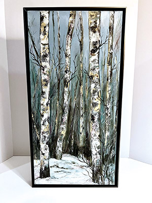 Framed original acrylic on canvas painting titled “Birch Trees in Winter.” Measures 16 x 20 inches.