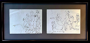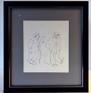 Two original signed drawings, black ink on paper by the late master Ardeshir Mohassess. Measures 29.5 x 14.5 inches framed.