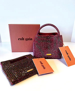 A pink SOLENE MINI RHINESTONE BAG crafted with a classic clear rhinestone cover. This luxurious bag features an aluminum mesh body, circular handle, and diamond-shaped exterior. Sealed with a top toggle closure and lined interior, this stylish accessory is the perfect finishing touch for your most exclusive ensembles. A pink LUCINDA NANO RHINESTONE CLUTCH. This is an elegant, nano-sized top handle bag featuring a dazzling rhinestone mesh exterior that is guaranteed to get attention. The interior is kept safe with a zipper closure. She is small, but capable of carrying your essentials.