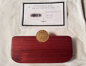 Beautifully made evening clutch designed by Hamed Mirzaei using rosewood and 5 Ashrafi Naseri coin title TOGHRA which means the king’s signature. Certificate of authenticity included.