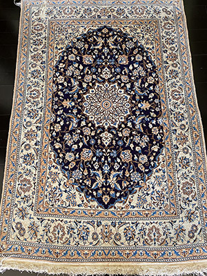 A 100% hand-woven Iranian wool carpet from the Naeen region of Iran measuring 5.2 x 3.7 feet. Has two minor repairs.