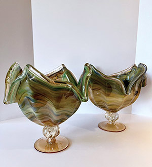A pair of outstanding decorative Murano Glass footed bowls with a modern design and mesmerizing multicolored pattern to add a touch of refinement to your home environment. Handmade blown glass in Murano, Italy.