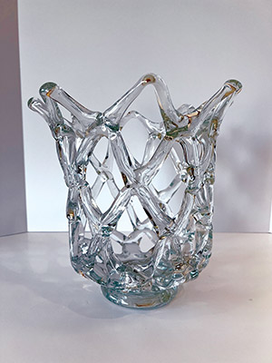 This large modern mouthblown clear glass vase, woven with precision, makes the perfect centerpiece for any home.