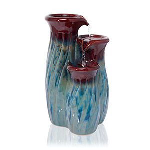 Three 3-tier glossy blue speckled ceramic case tabletop fountain measuring 7 x 6 x 11 inches, plus a large Rio de Janeiro scented candle by Illuminaria. 160 burn hours. Glass dimensions: 7 x 14 inches. Box dimensions: 7.5 x 7.5 x 14.5 inches.