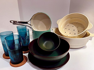 Upgrade your kitchen with eco-friendly products of Bloomhouse by Daniel Gabbay in partnership with OneTreePlanted. Package includes a 12-piece nonstick cookware set in asage green exteriors, an 8-piece tumbler and coaster set in the enchanting Lyon Sky color, and an 18-piece Palmero Sun stoneware dish collection in the stunning shade of Agave.