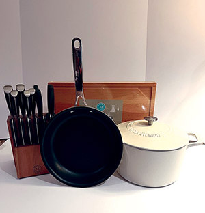 A full kitchen collection by Martha Stewart. Upgrade your kitchen with this comprehensive set of 10 non-stick white pans and pots, an 18-inch roasting pan with a Martha-blue exterior, a cast iron 7 QT Dutch oven complete with a lid and white enamel interior, a 14-piece black cutlery set featuring acacia wood accents, and a 18 x 12 inch cutting board crafted from beech wood.