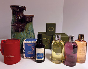 Immerse yourself in the soothing ambiance created by the Plaza Athenee Candle, the L’Occitane Cocon de Sérénité Relaxing Candle and Relaxing Pillow Mist, and the Molton Brown Floral & Spicy Bathing Gift Set. Package also includes two Alpine vase tabletop fountains.