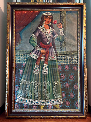 A Qajar dynasty-era oil painting of Nur-Al Saltaneh by renowned painter Mohammad Hamidi. A striking representation of the Qajar dynasty’s artistic prowess. This piece, hailing from the late 18th to early 20th century in Iran, beautifully encapsulates the opulence and sophistication of the era. Measuring 30 x 40 inches.