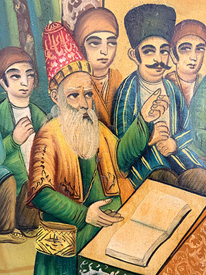 This vibrant Qajar-era oil on canvas captures a traditional ghahveh-khaneh (coffeehouse) scene, where a storyteller recites passages from Ferdowsi’s Shahnameh to an attentive gathering. Richly detailed, the composition depicts a lively interior with musicians, servers, and townsfolk surrounding a central fountain, evoking the communal and cultural spirit of the period.