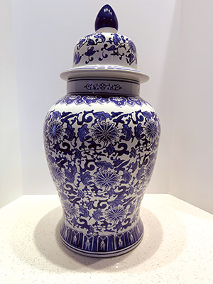 Add timeless elegance to your décor with this striking large ginger jar. Standing 25 inches tall, it is painted entirely by hand in the classic chinoiserie tradition of blue-and-white wares. Exuding both artistry and grandeur, this jar makes an impressive statement as focal accent décor. A perfect blend of heritage craftsmanship and refined design, it will surely elevate any space with enduring beauty.
