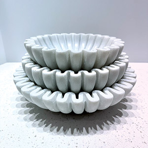 This set of three handcrafted bowls, made from solid chunks of Banswara marble, showcases remarkable artistry from skilled craftsmen in India. Available in three sizes—9, 10, and 12 inches in diameter—each bowl features an ivory hue with subtle brown veining throughout. The delicate fluted design, created using a specialized tool, produces rippling patterns that circle each bowl, transforming the marble in a way rarely seen. These unique decor pieces bring a touch of natural elegance to any setting, with each size adding its own distinct charm.