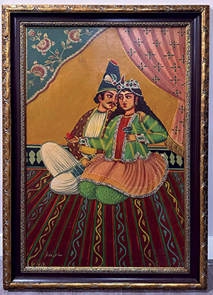 A framed oil-on-canvas painting by artist Ali Larani, depicting a bride and groom during the Qajar period. This piece captures the elegance and historical richness of the era through Larani’s skilled brushwork and attention to detail. Measuring approximately 48 x 32 inches framed.