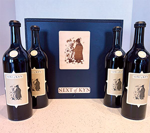 A limited production box set of four 750 ml. bottles of Next of Kyn Quatro from Cumulus Vineyard, vintage 2021. Produced by Sine Qua Non Vineyards.