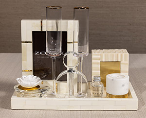The Carlyle Gift Set is a sophisticated collection of curated items that exude elegance and timeless style. It includes a Maha White Bone Inlay Tray (14”x7”) that serves as a stunning display piece, paired with a White Bone Chips & Brass Box for refined storage. The set features a Bodega Marble and Brass Tealight Holder, perfect for adding a warm glow to any space, alongside a Modern Morocco Glass Perfume Bottle in a chic cube shape, ideal for holding favorite scents. Completing the collection are an Optic Champagne Flute with a gold rim for celebratory toasts, the Dream Mini- Crystal Edition in Moroccan Peony for a touch of luxury, and a St. Ives Bone Inlaid Photo Frame (5x7) to showcase cherished memories. This thoughtfully assembled set makes an exquisite gift, combining beauty and functionality for a lasting impression.