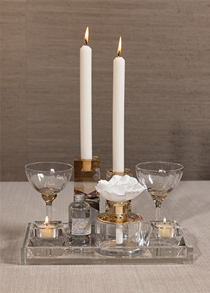 The Carlyle Gift Set is a refined ensemble of luxury items, perfect for elevating any space with elegance and charm. This curated set includes a Claire Crystal Glass Vanity Tray (12” x 6.5” x 1.25”), offering a sleek base for displaying essentials. It features two Colette Martini/Cocktail Glasses in a subtle light amber shade, adding a touch of sophistication to any gathering. The Dina Clear Crystal Tealight Holders (set of two) create a warm, inviting ambiance, while the Vienna Artistry Two-Tone Crystal Candlesticks in smoke and gold (5” and 6.5”) bring a dramatic yet tasteful touch. Completing the collection is the Venezia Porcelain Diffuser in Arielle, filling the air with a luxurious fragrance. This set makes a stunning gift, combining classic beauty with a modern edge.